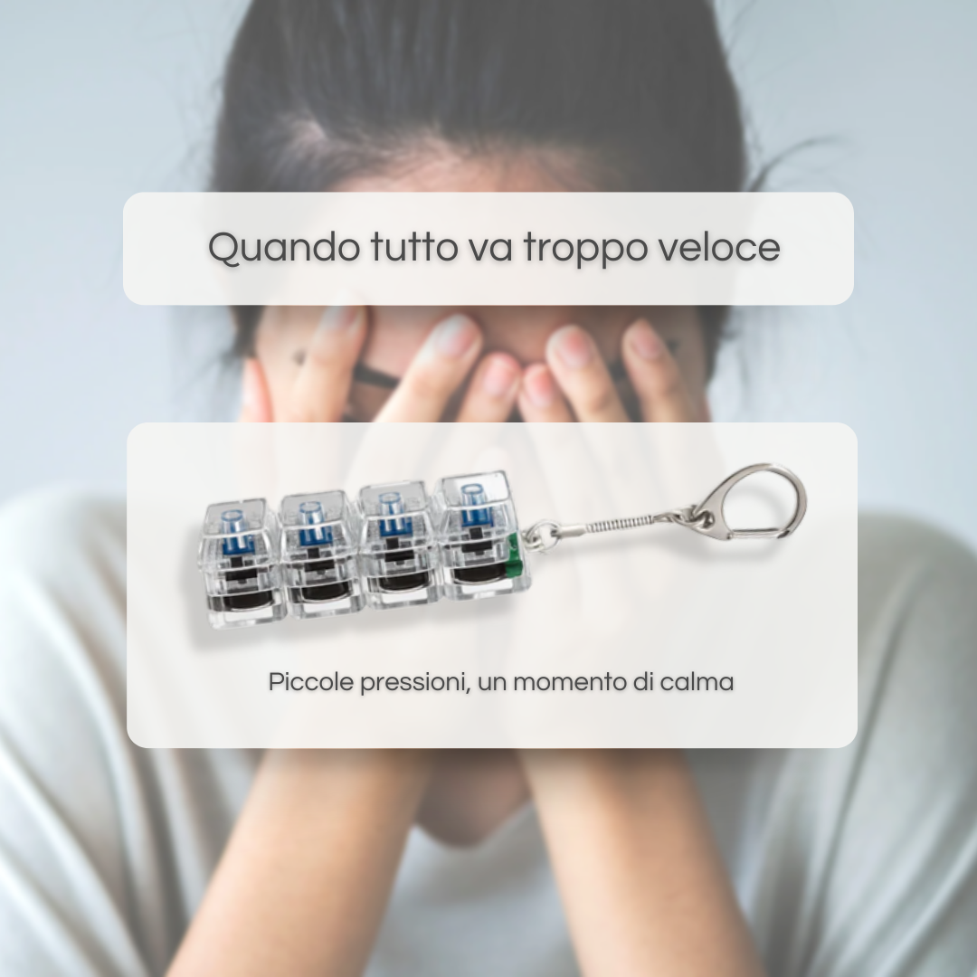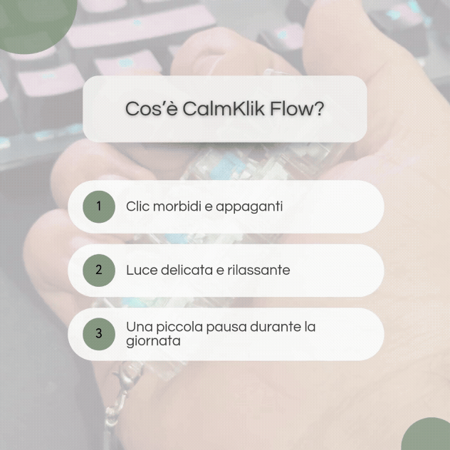 CalmKlik Flow aiuta a canalizzare la tensione attraverso piccole pressioni morbide, creando un momento di pausa anche nelle giornate più impegnative.